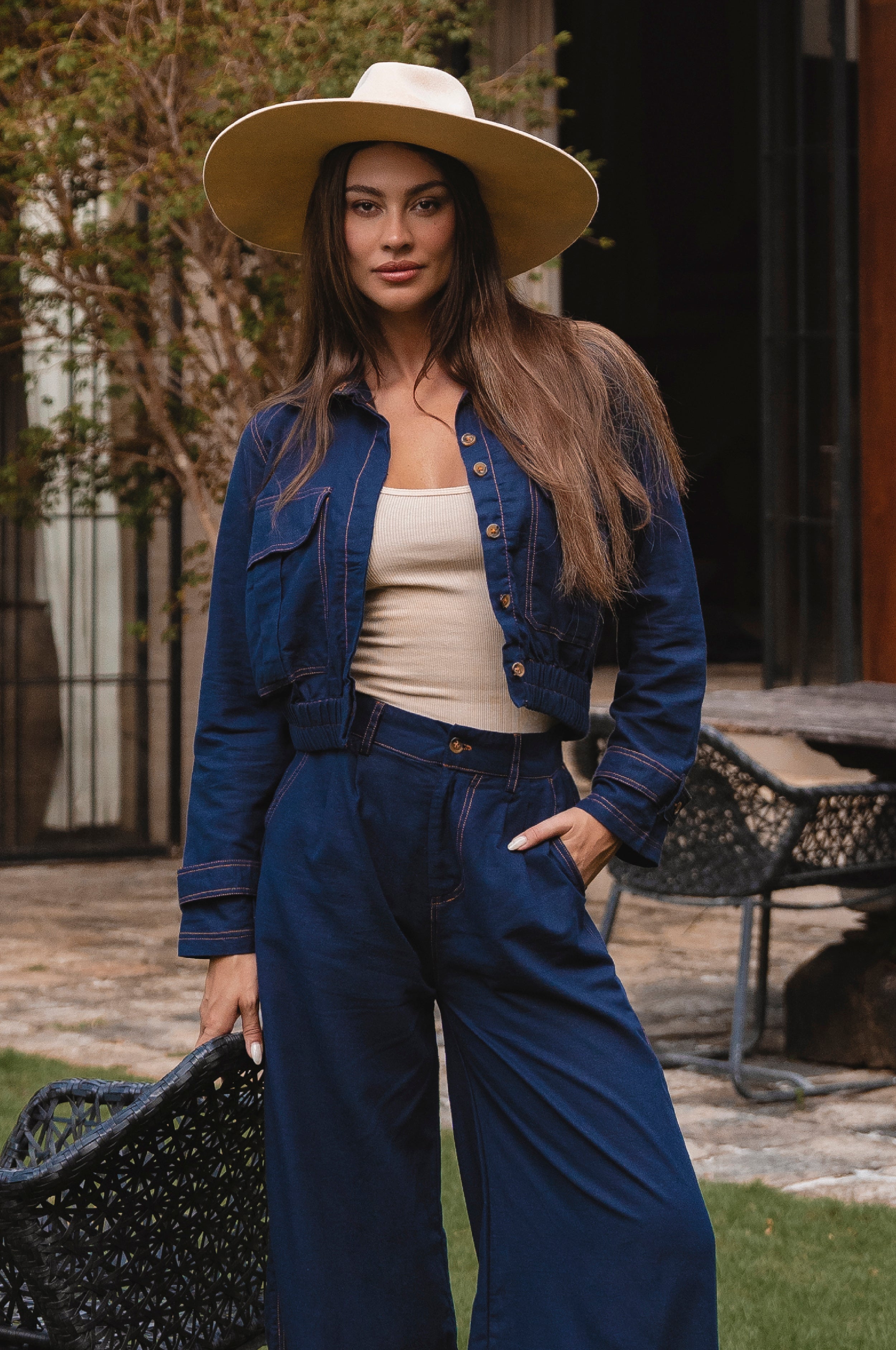 Handmade from structured linen this cropped jacket features denim-like design with a collared neckline, utility pockets, and an elasticated waist for a flattering, casual silhouette. Perfect for layering or pairing with the matching pants.