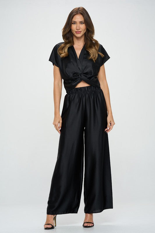 Made in USA Satin Short Sleeve Top with Front Twist. Available in other Colors. Fabric content: 97% Polyester, 3% Spandex.