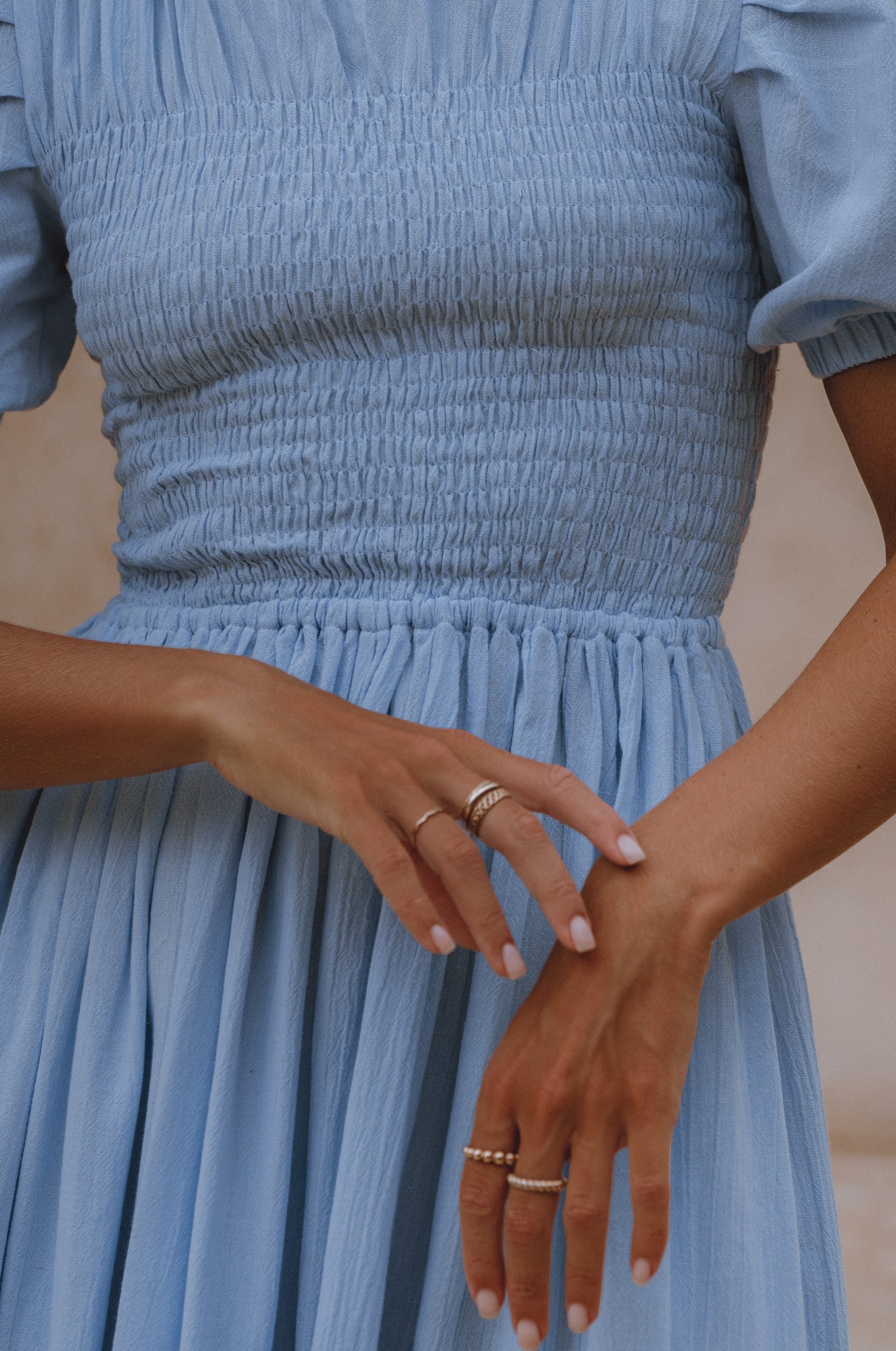 Our beautifully detailed Sophie dress is handmade from lightweight crinkle linen. Designed in midi silhouette with a shirred bodice and puff sleeves it can be styled for any occasion.