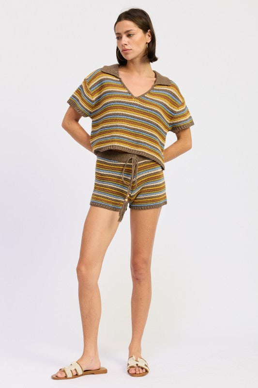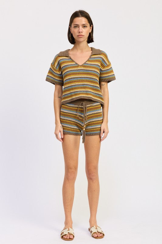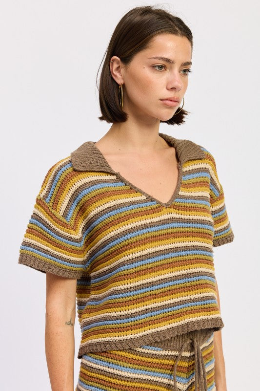 • STRIPED CROCHET KNITTED COLLARED TOP